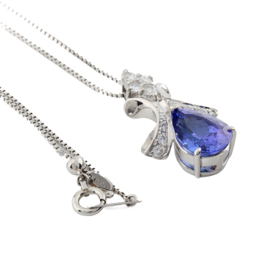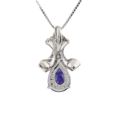 Tanzanite and Diamond pendant with pear shape Natural Tanzanite of 2.84ct and round Natural Diamonds totalling 0.28ct. Platinum - 900 with 45cm Platinum - 850 adjustable chain. Weight: 7.7g. (pre-owned)