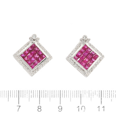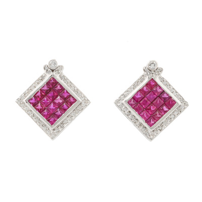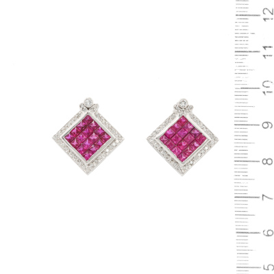 Ruby and Diamond earrings with princess cut Natural Rubies totalling 2.85ct and round Natural Diamonds totalling 0.42ct (Estimated grading: HIJ SI-P1). 18ct white gold with 18ct white gold & silicon backs. Weight: 7.3g. (Pre-owned)
