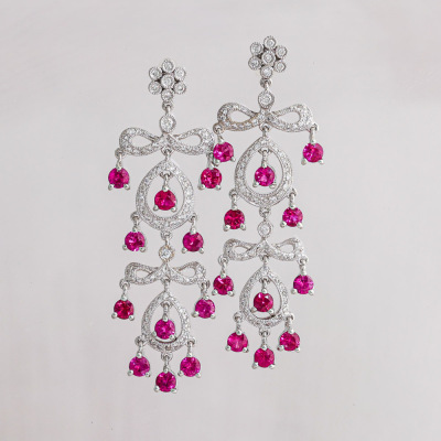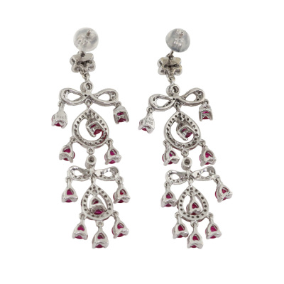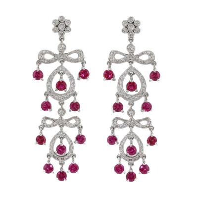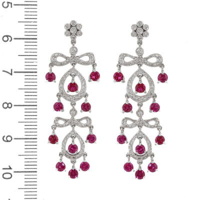 Chandelier earrings with round Natural Rubies totalling 2.86ct and round Natural Diamonds totalling 0.67ct (Estimated grading: H-I SI-P1). 18ct white gold with 14ct white gold & silicon backs. Length: 4.8cm. Weight: 9.8g. (Pre-owned)