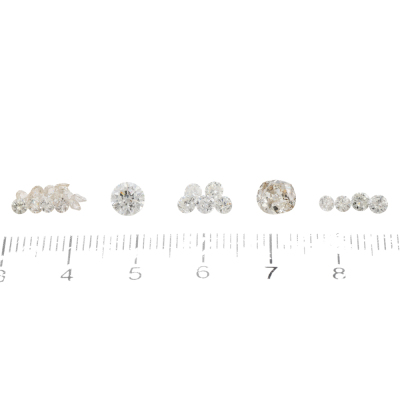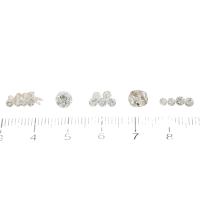 A loose parcel of 25 round brilliant cut Natural Diamonds totalling 2.88ct. With a old cut Natural Diamond of 0.78ct (Estimated grading: J-K P2-P3), a round Natural Diamond of 0.58ct (Estimated grading: F-G P1), 5 round Natural Diamonds totalling 0.47ct (Estimated grading: H-I VS-SI), 4 round Natural Diamonds totalling 0.30ct (Estimated grading G-H SI) and 14 round Natural Diamonds totalling 0.75ct (Estimated grading: G-J SI-P1). Approximate size: 5.6 x 6mm - 2.3mm. (Pre-owned)