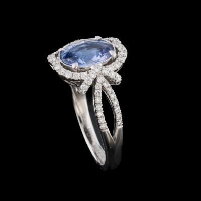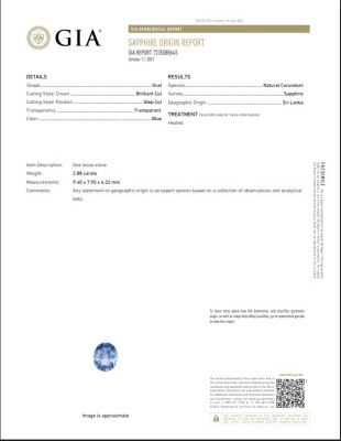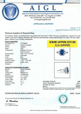 Sapphire and Diamond Karl Haas ring with centre oval shape Sri Lankan Natural Blue Sapphire of 2.88ct (with GIA Certificate of Origin #7235088645) and round Natural Diamonds totalling 0.51ct (Estimated grading: H-I VS-SI). Platinum-950. Ring size M 3/4. Width: 2.1mm-3.2mm. Weight: 7.6g. With AIGL Appraisal Report dated 17/01/2024.