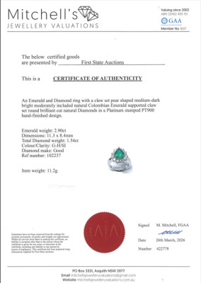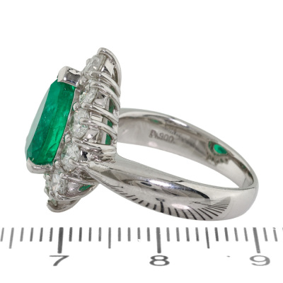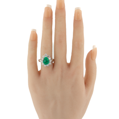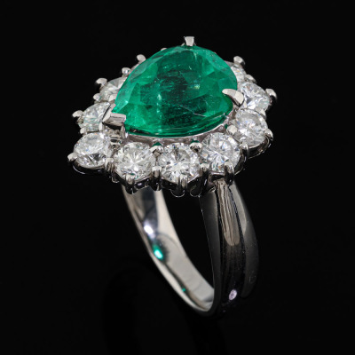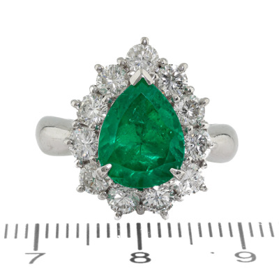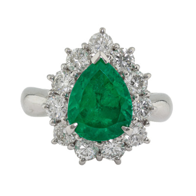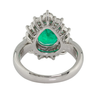 Emerald and Diamond ring with centre pear shape Natural Colombian Emerald of 2.90ct and round Natural Diamonds totalling 1.54ct (Estimated grading: GH SI). Platinum 900. Band width: 2.9mm - 4.1mm With Certificate #422778.