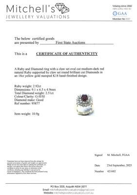 Ruby and Diamond ring with centre oval shape Natural Ruby of 2.92ct and round Natural Diamonds totalling 2.51ct (Estimated grading: G-H SI) 18ct yellow gold. Ring size M 1/4. Band width: 3.4mm - 3.8mm. Weight: 10.9g. With Certificate #421602. (Pre-owned)