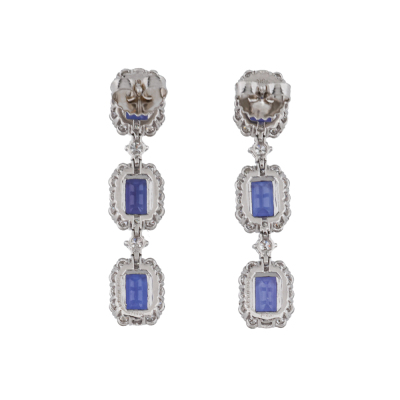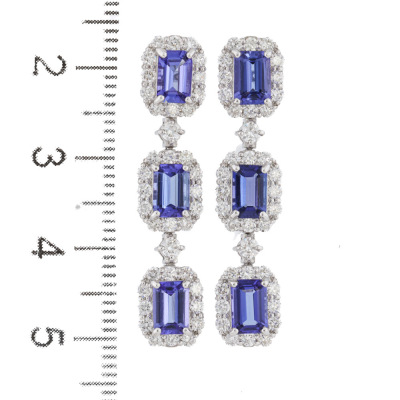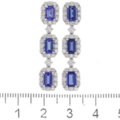 Tanzanite and Diamond dangle earrings with 6 emerald cut Natural Tanzanite totalling 2.95ct and round Natural Diamonds totalling 1.48ct (Estimated grading: H-I SI). Platinum - 900 with 18ct white gold backs. Weight: 6.4g