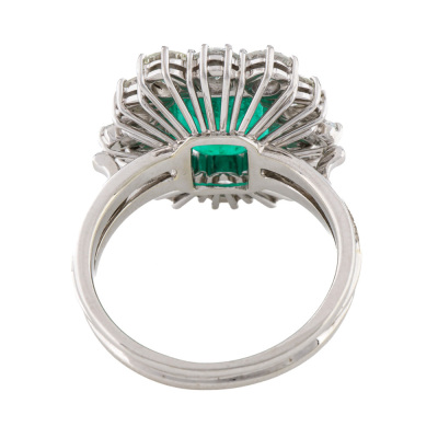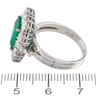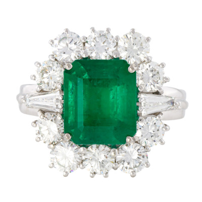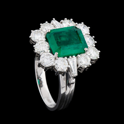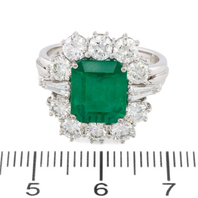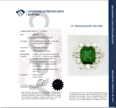 Emerald and Diamond ring with emerald cut Zambian Natural Emerald of 2.95ct (With copy of GSL Report #AA71867/2) and round & baguette cut Natural Diamonds approximately totalling 2.00ct (Estimated grading: GH VS-SI). 18ct white gold. Ring size N3/4. Band width: 2.7mm - 3.6mm. Weight: 7.7g.