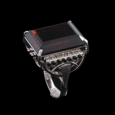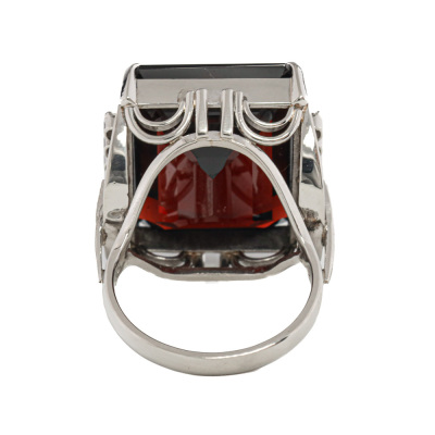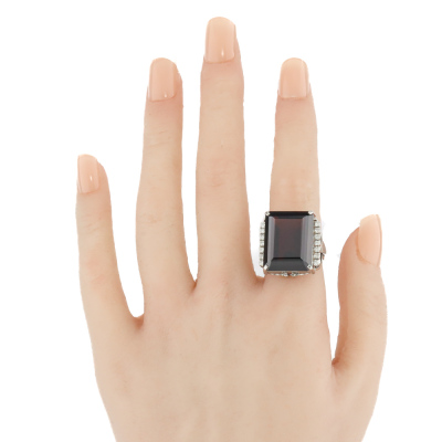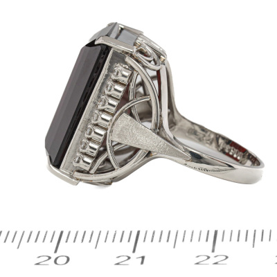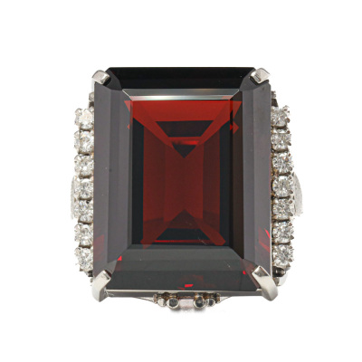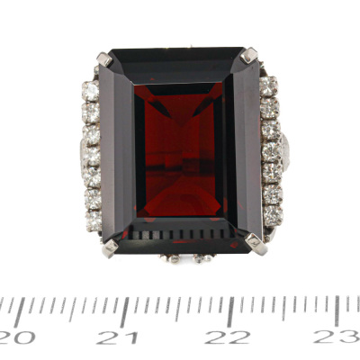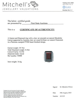 Garnet and Diamond Ring with centre emerald cut Natural Rhodolite Garnet of 29.74ct and 14 round Natural Diamonds totalling 0.34ct (Estimated grading: H-I SI). Platinum - 900. Ring size M. Band width: 2.5mm. Weight: 16.6g. With Certificate #421319.