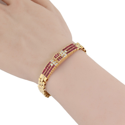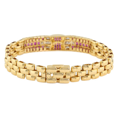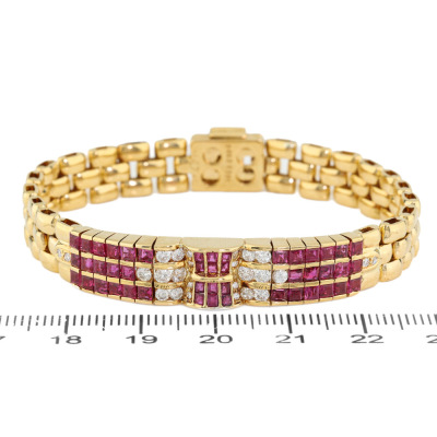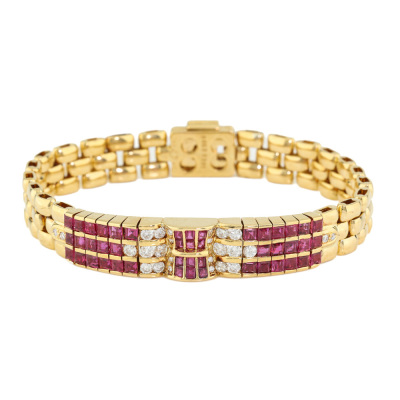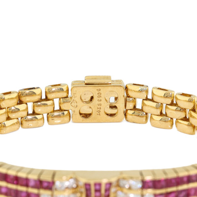 Ruby and Diamond bracelet with carre cut Natural Rubies totalling 2.97ct and round Natural Diamonds totalling 0.63ct (Estimated grading: GHI SI-P1). 18ct yellow gold. Length: 17cm. Width: 8.8mm. Weight: 29.1g. With Certificate #421783.