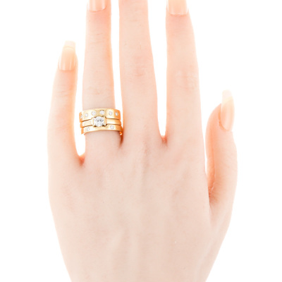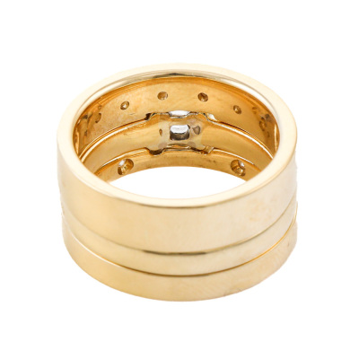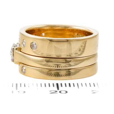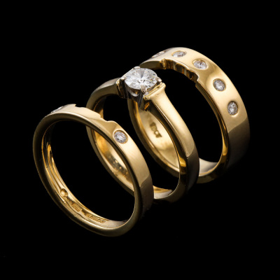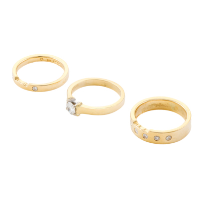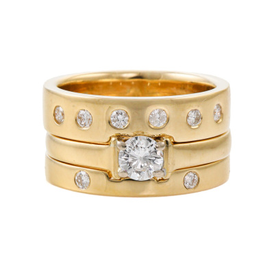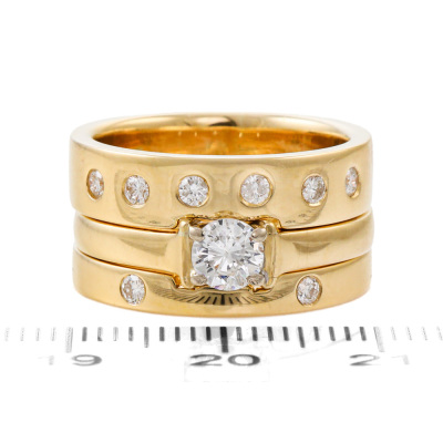 Set of 3 stackable Diamond rings. 1) Diamond solitaire ring with centre round Natural Diamond of approximately 0.40ct (Estimated grading: G SI). Ring size L3/4. Band width: 2.6mm - 2.8mm. 2) A fitted wide band Diamond ring with 6 round Natural Diamonds totalling approximately 0.18ct. Ring size M. Band width: 4.9mm. 3) A fitted Diamond band ring with 2 round Natural Diamonds totalling approximately 0.06ct. Ring size L3/4. Band width: 2.7mm. All rings are 18ct yellow gold. Total weight: 15.7g. With Copies of Valuation dated 29/11/2024.