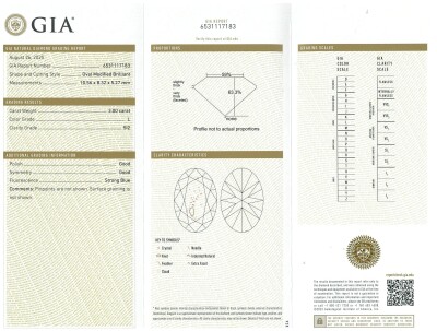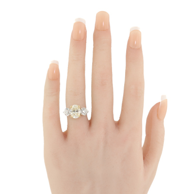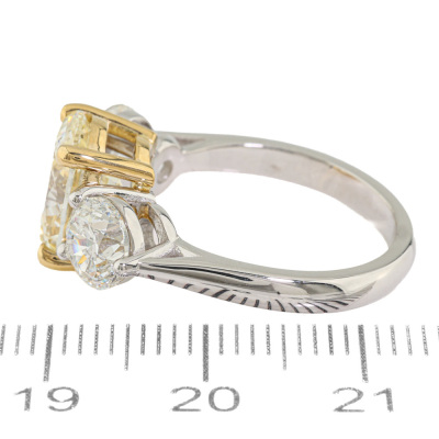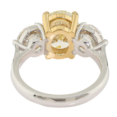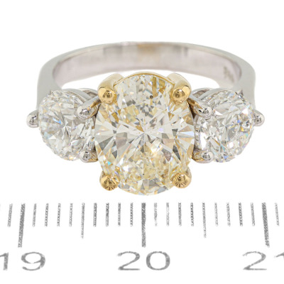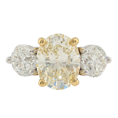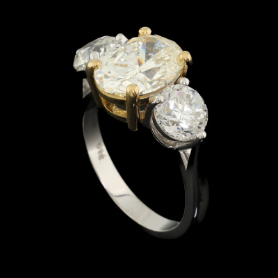 Diamond ring with centre oval shape Diamond of 3.00ct (with GIA Diamond Report graded as L SI2 #6531117183) and 2 round Natural brilliant cut diamonds totalling 2.00ct (with GIA Diamond Reports graded as G SI2 #1539473521 & H SI2 #7531274650). 18ct yellow and white gold. Ring size L1/4. Band width 2.6mm - 2.0mm. Weight 6.6g