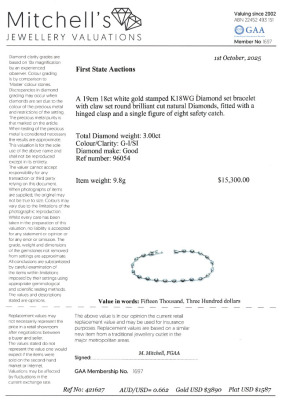 Diamond bracelet with 19 round Natural Diamonds totalling 3.00ct (Estimated grading: GHI SI). 18ct white gold. Length: 19cm. Weight: 9.8g. With Valuation Certificate #421627. (Pre-owned)
