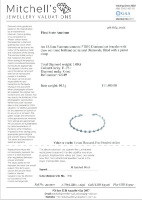 Diamond bracelet with round Natural Diamonds totalling 3.00ct (Estimated grading: H-I SI). Platinum - 850. Length: 18.5cm. Weight: 10.5g. With Valuation Certificate #420907. (Pre-owned)