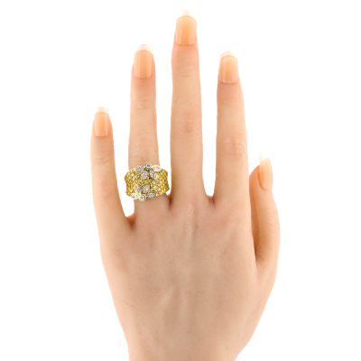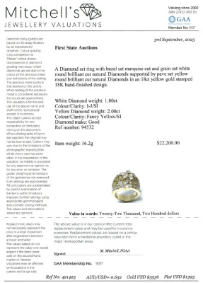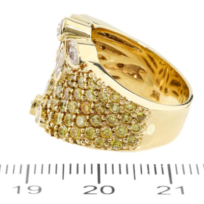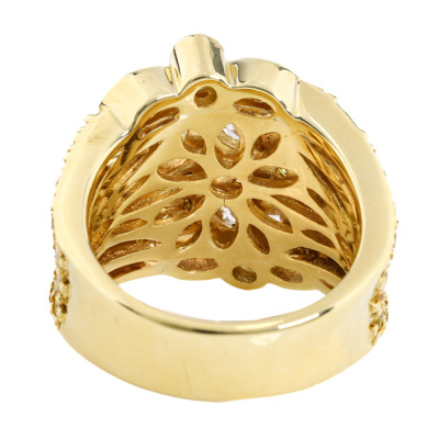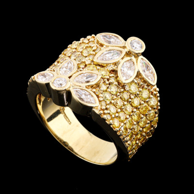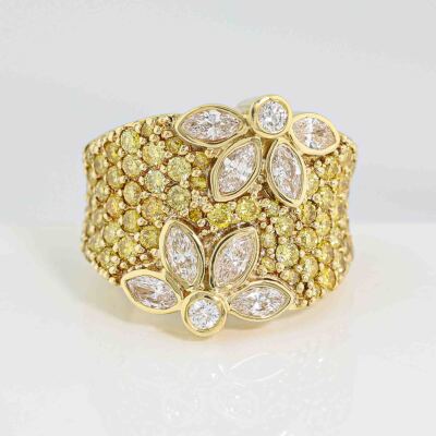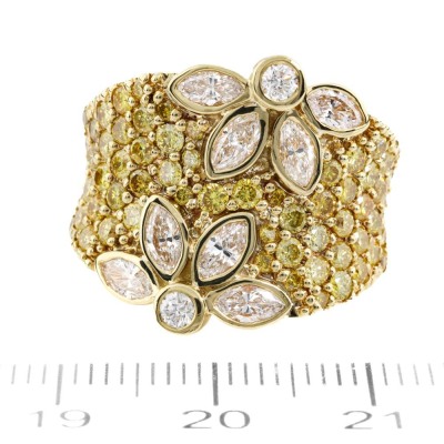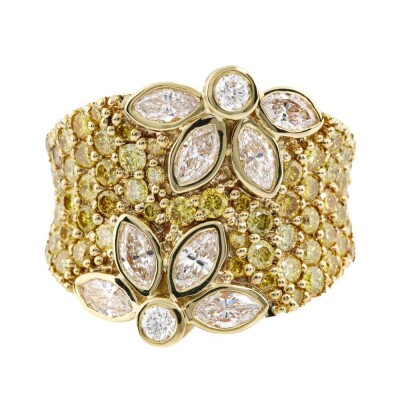 Flora design ring with round & marquise cut Natural Diamonds totalling approximately 3.00ct (Estimated grading: Fancy Yellow & I-J SI). 18ct yellow gold. Ring size M1/4. Band width: 6.1mm - 7.8mm. Weight: 16.2g. With Valuation Certificate #421425. (Pre-owned)