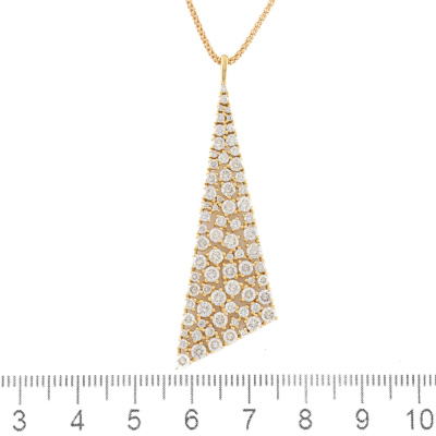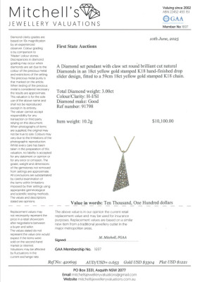 Diamond pendant with round Natural Diamonds totalling 3.00ct (Estimated grading: H-I SI). 18ct yellow gold with 59cm 18ct yellow gold chain. Weight: 10.2g. With Valuation Certificate #420695. (Pre-owned)