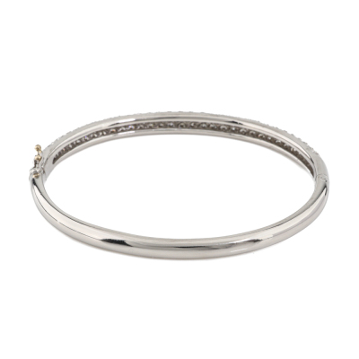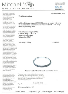 Diamond bangle with round Natural Diamonds totalling 3.00ct (Estimated grading: G-H VS-SI). Platinum-900. Inner circumference: 16cm. Weight: 27.4g. With Valuation Certificate #421597. (Pre-owned)