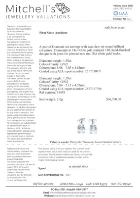 Diamond stud earrings with 2 round brilliant cut Natural Diamonds totalling 3.00ct (with GIA Reports graded as G SI2 # 2517330871, 2527017794 ). 18ct white gold. Weight: 2.0g. With Valuation Certificate #420829. (New)