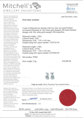 Diamond stud earring with round brilliant cut Natural Diamonds totalling 3.00ct (with GIA Reports graded as J SI1 #1528736136 & J VS2 #6525668145 ). 18ct white gold. Weight: 2.0g. With Valuation Certificate #421970. (New)