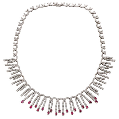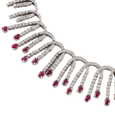 Ruby and Diamond necklace with oval shape Natural Rubies totalling approximately 3.00ct and round Natural Diamonds totalling approximately 10.00ct (Estimated grading: G-H SI). 14ct white gold. Length: 47cm. With Certificate #422919.