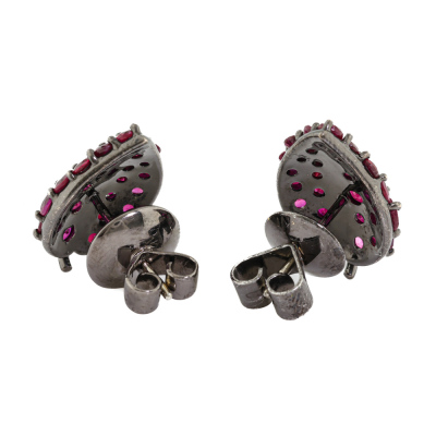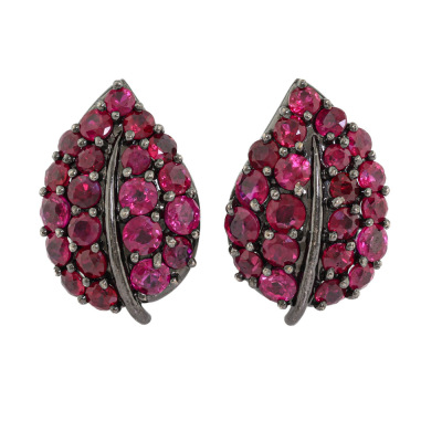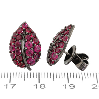 Leaf design earrings with round Natural Rubies totalling approximately 3.00ct. 18ct white gold with black rhodium plating and 18ct white gold backs. Dimensions: 17.5mm x 11.2mm. Weight: 6.9g.
