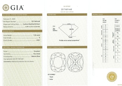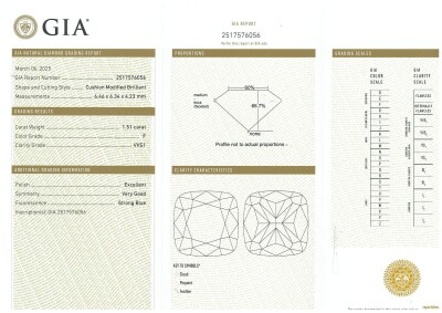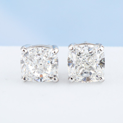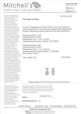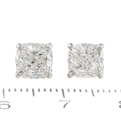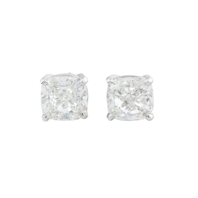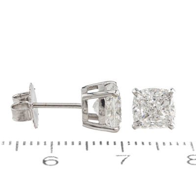 Diamond stud earring with cushion cut Natural Diamonds totalling 3.01ct (with GIA Reports graded as E VVS1 #2517481448 & F VVS1 #2517576056). 18ct white gold. Weight: 2.6g. With Valuation Certificate #420815. (New)
