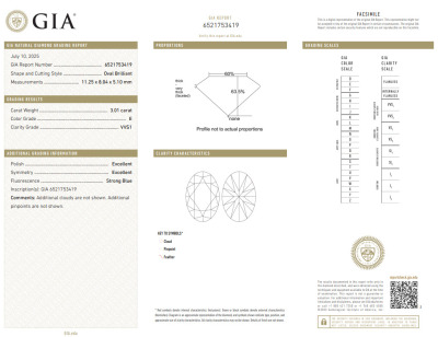 A loose oval shape natural Diamond of 3.01ct (with GIA report graded as E VVS1 #6521753419). (New)