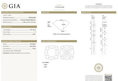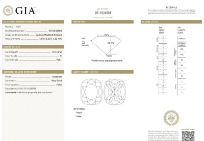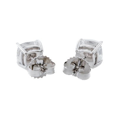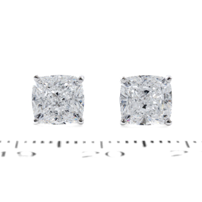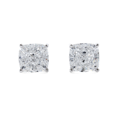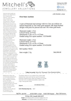 Diamond stud earring with cushion cut Natural Diamonds totalling 3.02ct (with GIA Reports graded as E VVS1 # 2514536588, 1525566488). 18ct white gold. Weight: 2.5g. With Valuation Certificate #421762. (New)