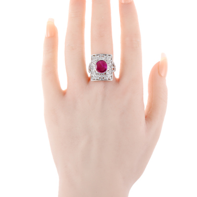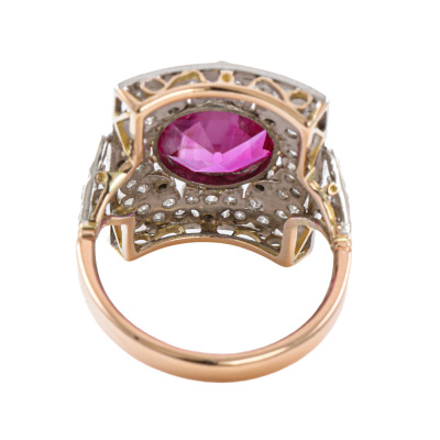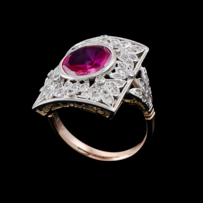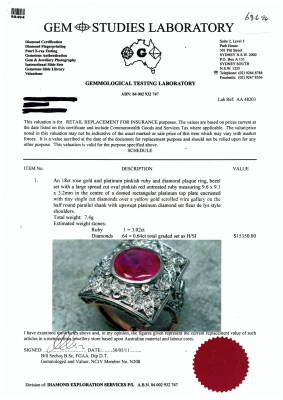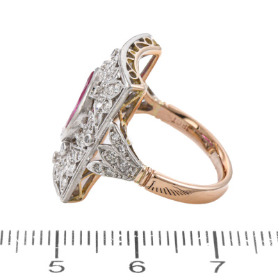 Ruby and Diamond ring with centre oval unheated Natural Ruby of 3.02ct and round Natural Diamonds totalling 0.64ct (Estimated grading: H SI). 18ct rose gold & Platinum 650 (XRF tested, stamped '18ct'). Ring size: M1/4. Band width: 2.7mm. Weight: 7.4g. With GSL Description Report #AA48203. (Pre-owned)