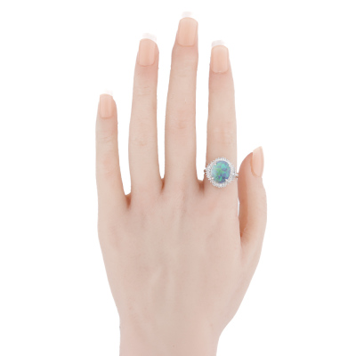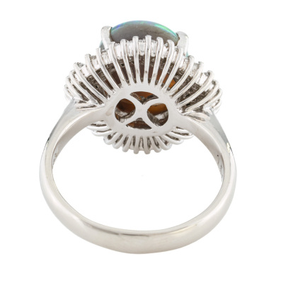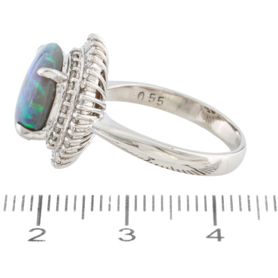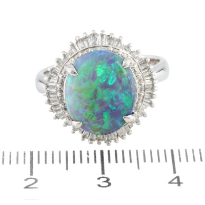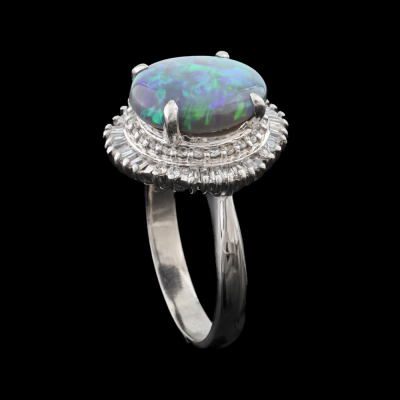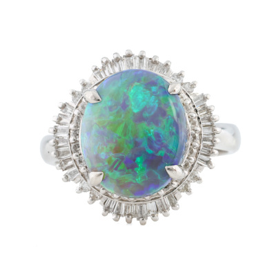 Opal and Diamond ring with centre oval cabochon cut solid Natural Black Opal of 3.03ct and round & baguette cut Natural Diamonds totalling 0.55ct (Estimated grading: G-H VS-SI). Platinum - 900. Ring size: M3/4. Band width: 3.0mm - 2.8mm. Weight: 10.3g. (Pre-owned)