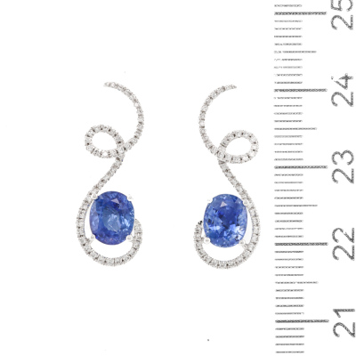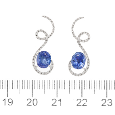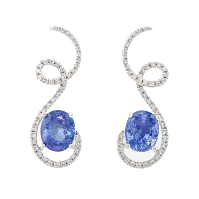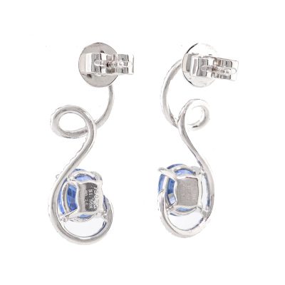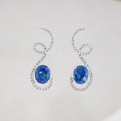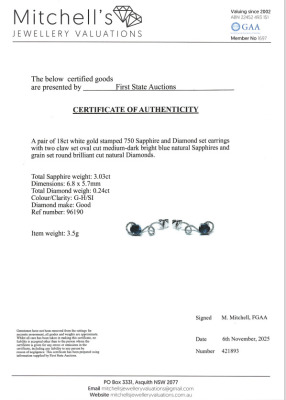 Sapphire and Diamond drop earrings with oval shape Natural Blue Sapphire totalling 3.03ct and round Natural Diamonds totalling 0.24ct. 18ct white gold. Length: 2.5cm. Weight: 3.5g. With Certificate #421893. (Pre-owned)