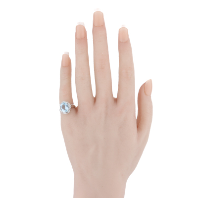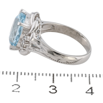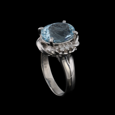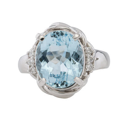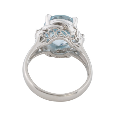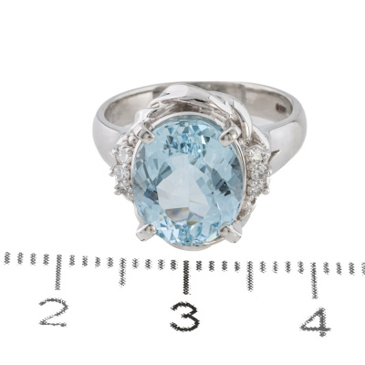 Aquamarine and Diamond ring with centre oval shape Natural Aquamarine of 3.04ct and round Natural Diamonds totalling 0.06ct. Platinum - 900. Ring size H 1/2. Band width: 2.7mm - 3.0mm. Weight: 6.5g.