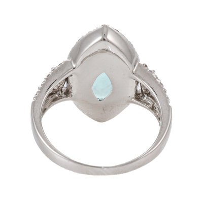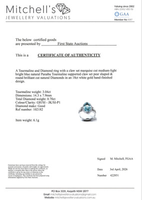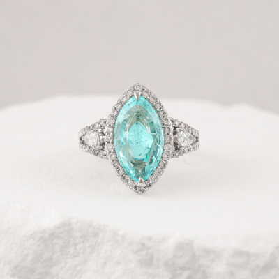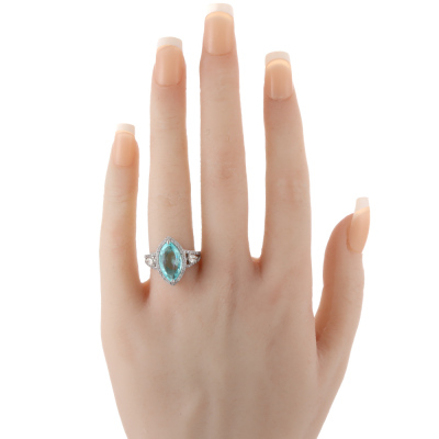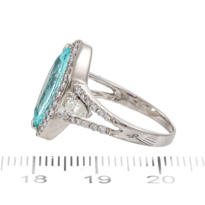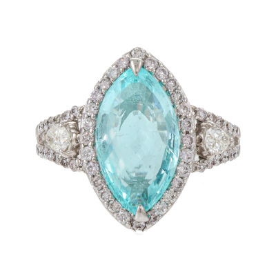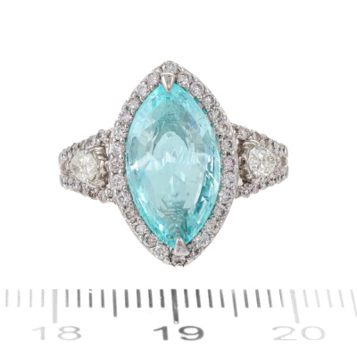 Tourmaline and Diamond ring with marquise cut Natural Paraiba Tourmaline of 3.04ct and round Natural Diamonds totalling 0.70ct (Estimated grading: GH SI & JK SI-P1). 18ct white gold. Band width: 1.7mm - 3.1mm With Certificate #422851.