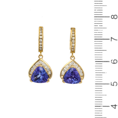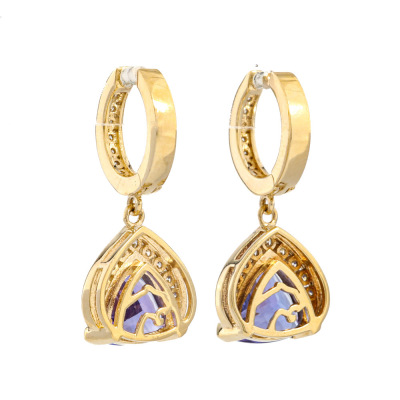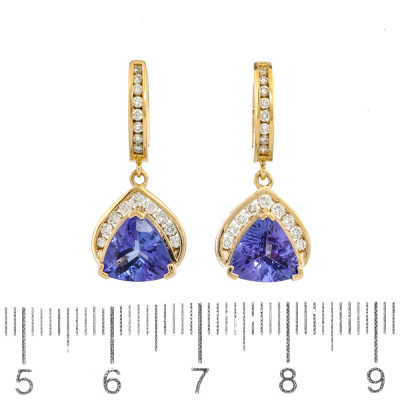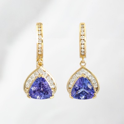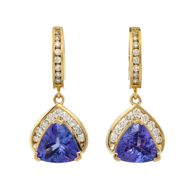 Tanzanite and Diamond drop earrings with 2 trilliant cut Natural Tanzanite totalling 3.04ct and round Natural Diamonds totalling 0.41ct (estimated grading: H-I P1). 14ct yellow gold. Weight: 5.0g. With copy of EFFY Invoice dated 28/12/2024. (Pre-owned)