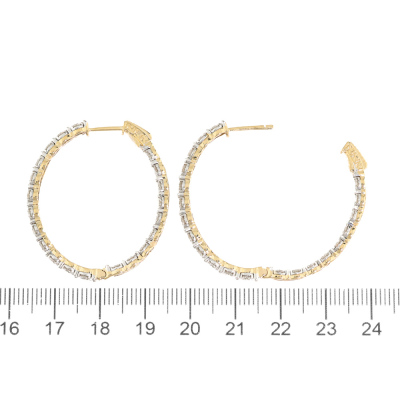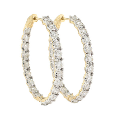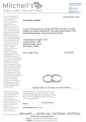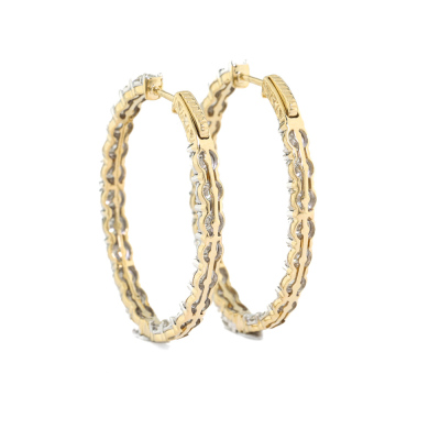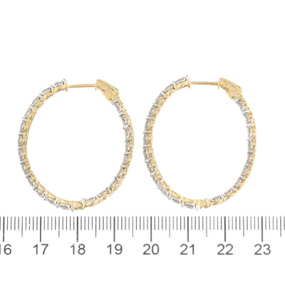 Diamond inside-out hoop earrings with 42 round Natural Diamonds totalling 3.07ct (Estimated grading: I-J SI). Back of the hoop has the Diamonds set inside the hoop. 14ct yellow gold. Oval shape hoop, size: 3.5 x 3.0mm. Weight: 9g. With Valuations Certificate #421889.