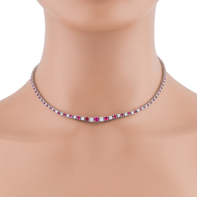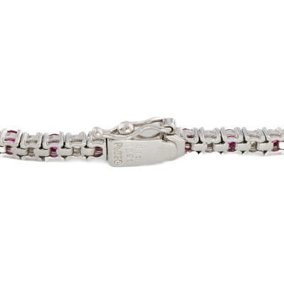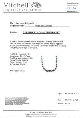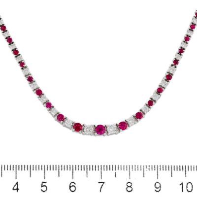 Ruby and Diamond necklace with round Natural Rubies totalling 3.10ct and round Natural Diamonds totalling 2.50ct (Estimated grading: G-H SI). Platinum - 850. Length: 39cm. Weight: 22.3g. With Certificate #421820.