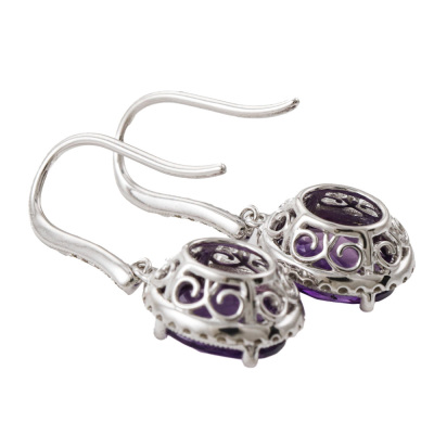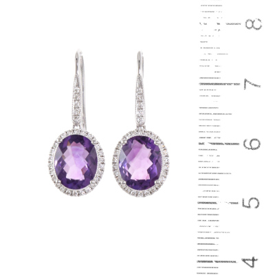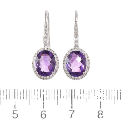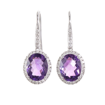 Amethyst and Diamond shepherds hook earrings with oval shape checkerboard natural Amethysts totalling 3.11ct and round natural Diamonds totalling 0.28ct. 14ct white gold. Weight: 3.2g.