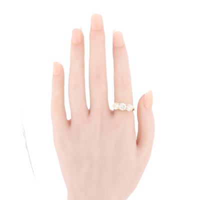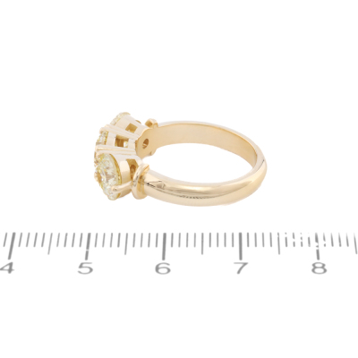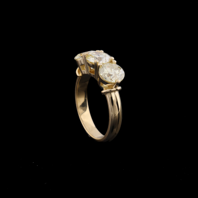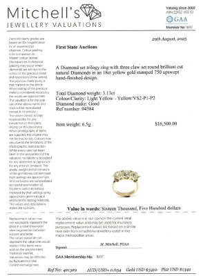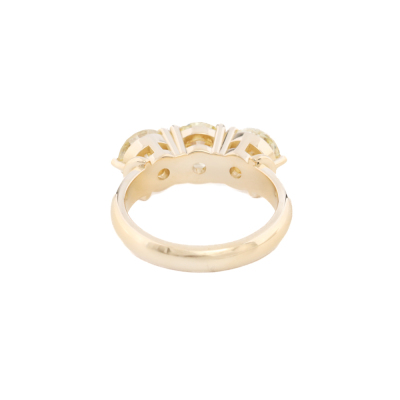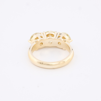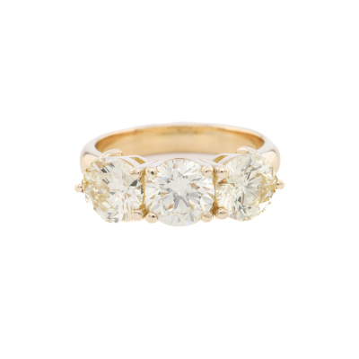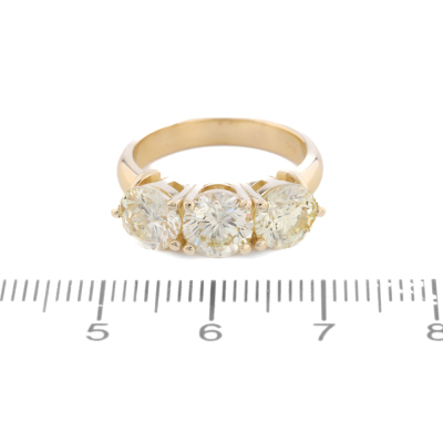 Diamond trilogy ring with 3 round Natural Diamonds totalling 3.13ct (Estimated grading: Light Yellow - Yellow VS2, P1 & P2). 18ct yellow gold. Ring size: L. Band width: 3.3mm - 3.5mm. Weight: 6.5g. With Valuation Certificate #421329. (New)