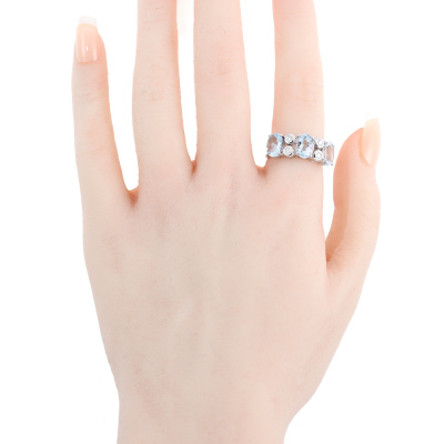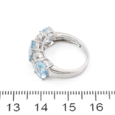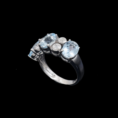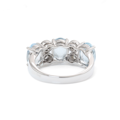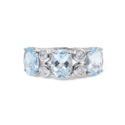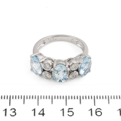 Aquamarine and Diamond ring with oval shape Natural Aquamarine totalling 3.15ct and round Natural Diamonds totalling 0.13ct. 18ct white gold. Ring size L1/2. Band width: 2.6mm - 4.2mm. Weight: 5.7g. (Pre-owned)