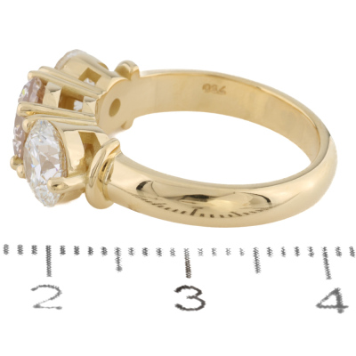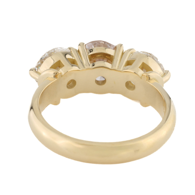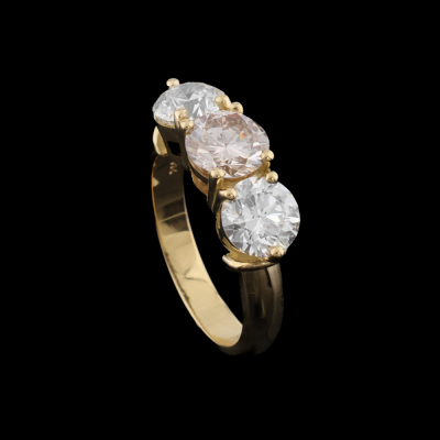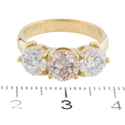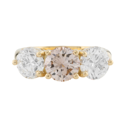 Diamond trilogy ring with 3 round Natural Diamonds totalling 3.15ct. Centre round brilliant cut Natural Diamond of 1.15ct (With GSL Report graded as Natural Medium Champagne VS2 #AA71662/3) and 2 round brilliant cut Natural Diamonds totalling 2.00ct (with GIA reports graded as E SI1 #6532606534, 1543246463). 18ct yellow gold. Ring size L1/2. Band width 3.1mm - 3.5mm. Weight 6.7g.