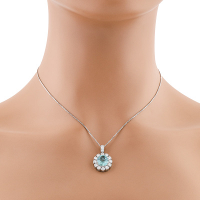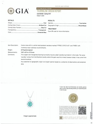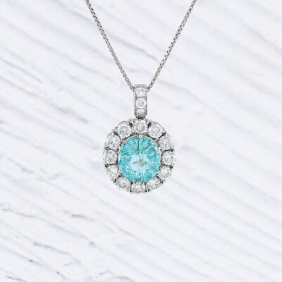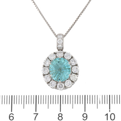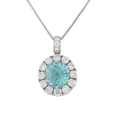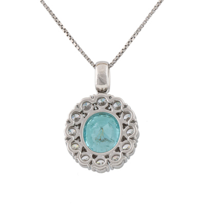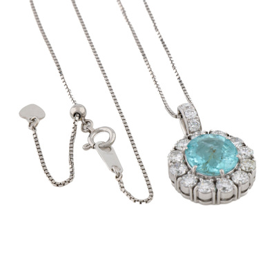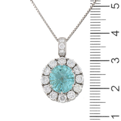 Tourmaline and Diamond pendant with centre oval shape Mozambique Natural Paraiba Tourmaline of 3.15ct and round Natural Diamonds totalling 1.45ct (Estimated grading: G-H VS-SI). Platinum - 900 with 45cm Platinum - 850 adjustable chain. Weight: 8.7g. With GIA Origin Report #1539661997.