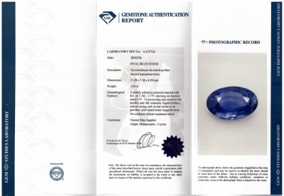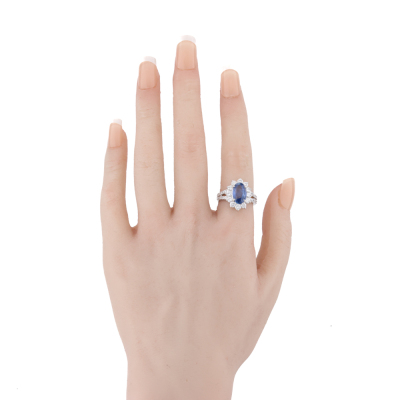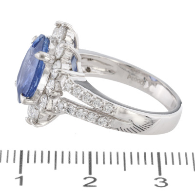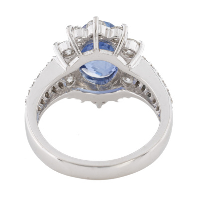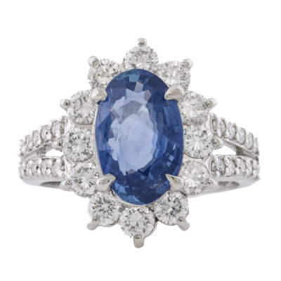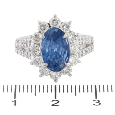 Sapphire and Diamond ring with centre oval shape unheated Ceylon Natural Blue Sapphire of 3.16ct (With GSL Report #AA71714) and round Natural Diamonds totalling 1.33ct (Estimated grading: G VS). Platinum - 900. Ring size M. Band width: 2.8mm - 3.8mm. Weight: 9.5g.