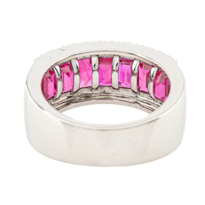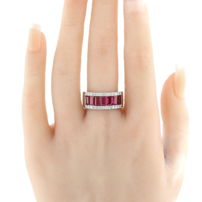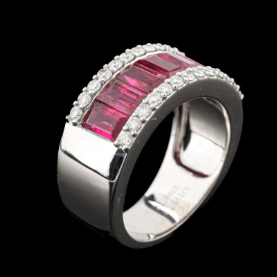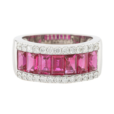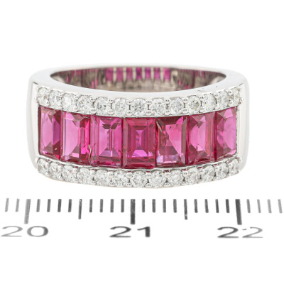 Ruby and Diamond dress ring with 7 baguette cut Natural Rubies totalling approximately 3.18ct and round Natural Diamonds totalling approximately 0.54ct (Estimated grading: HIJ SI). 18ct white gold. Ring size M3/4. Band width: 6.2mm - 8.4mm. Weight: 9.1g. (Pre-owned)