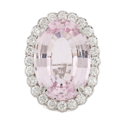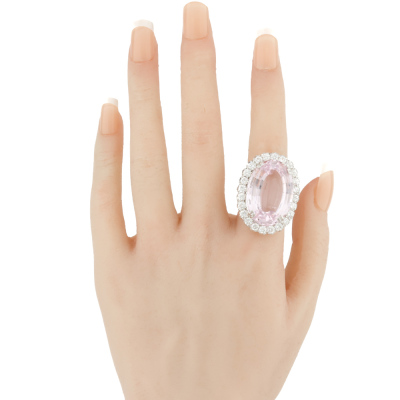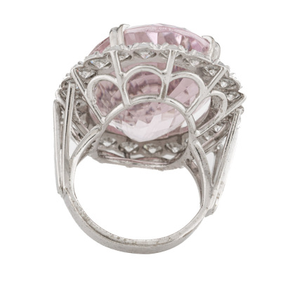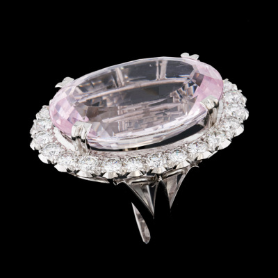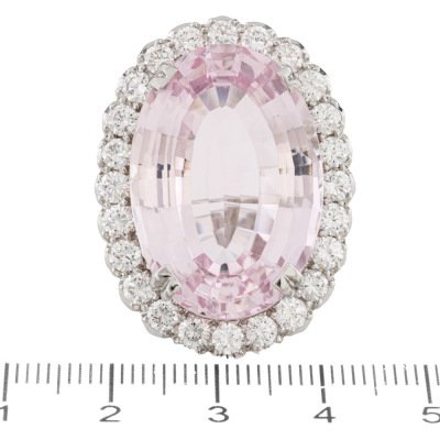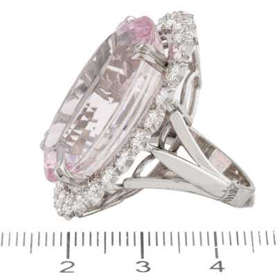 Kunzite and Diamond ring with centre oval shape Natural Kunzite of approximately 32.00ct and 24 round Natural Diamonds totalling approximately 2.40ct (Estimated grading: G-H VS). 9ct white gold (XRF tested, stamped 18ct). Ring size I1/4. Band width: 3.1mm. Weight: 16.7g