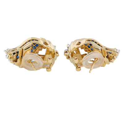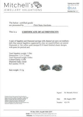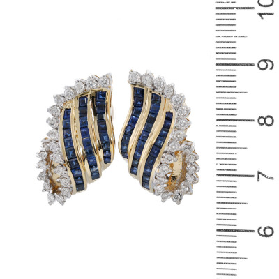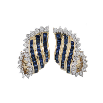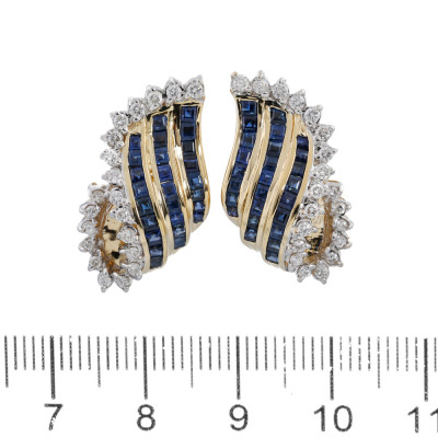 Clip-on earrings (for pierced ears) with carre cut Natural blue Sapphires totalling 3.20ct and round Natural Diamonds totalling 0.60ct (Estimated grading: I-J SI). Weight: 13.1g. With Certificate #421178. (Pre-owned)
