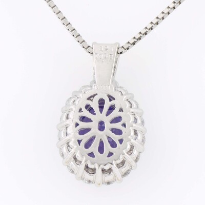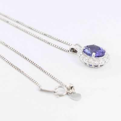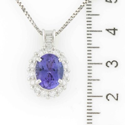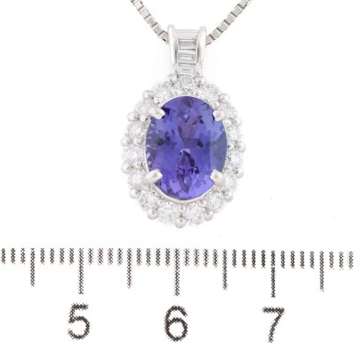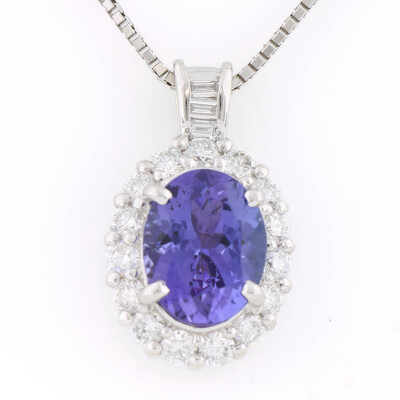 Tanzanite and Diamond pendant with centre oval shape Natural Tanzanite of 3.21ct and round & baguette cut Natural Diamonds totalling 0.98ct (Estimated grading: G VS-SI). Platinum - 900 with 45.5cm Platinum - 850 adjustable chain. Weight: 9.4g (Pre-owned)
