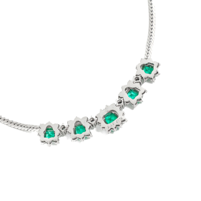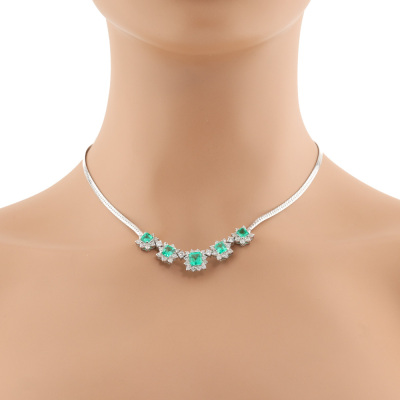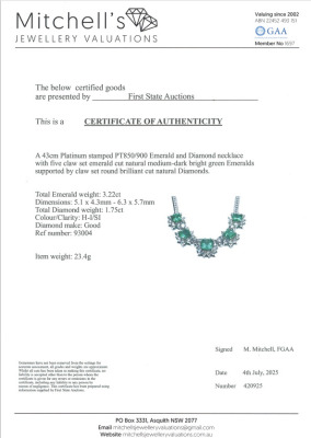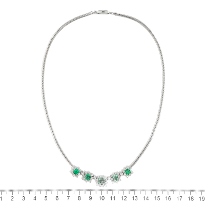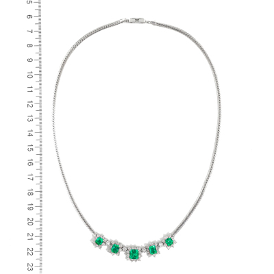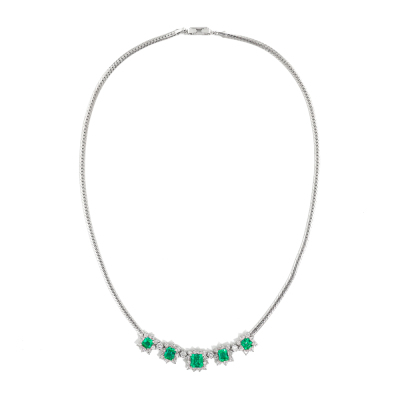 Emerald and Diamond necklace with 5 emerald cut Natural Emerald totalling 3.22ct and round Natural Diamonds totalling 1.75ct (Estimated grading: H-I SI). Platinum 900 with Platinum - 850 chain. Length: 43cm. Weight: 23.4g. With Certificate #420925. (Pre-owned)
