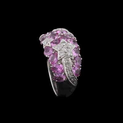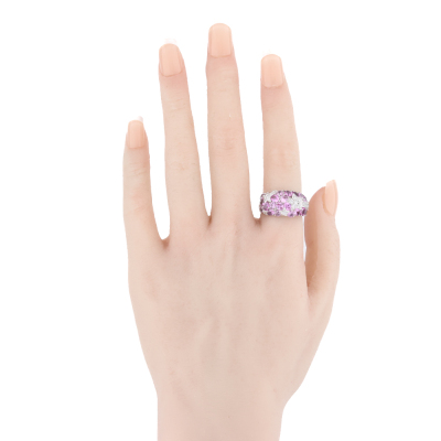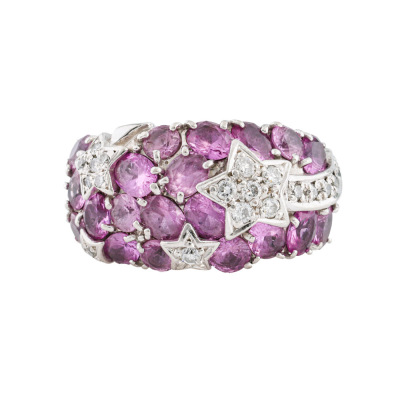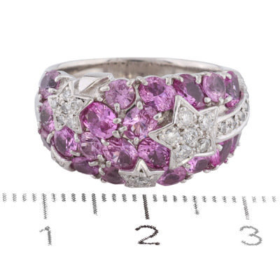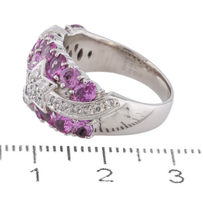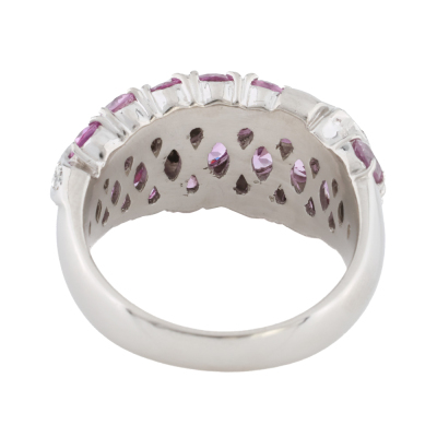 Sapphire and Diamond ring with round and oval shape Natural pink Sapphires totalling 3.22ct and round Natural Diamonds totalling 0.25ct. Platinum - 900. Ring size M. Band width: 3.5mm-7.2mm. Weight: 12.1g. (Pre-owned)