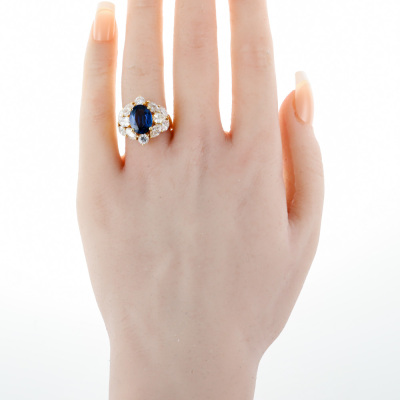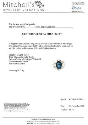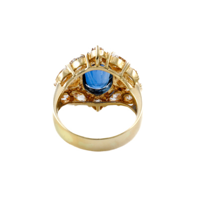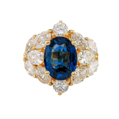Sapphire and Diamond ring with oval shape Natural Blue Sapphire of 3.26ct and mixed shape Natural Diamonds totalling 2.65ct (Estimated grading: G-H & Light Yellow SI). 18ct yellow gold. Ring size K3/4. Band width: 3.7mm - 4.5mm. Weight: 7.8g. With Certificate #421887. (Pre-owned)