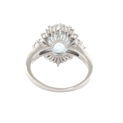 Aquamarine and Diamond ring with oval shape Natural Aquamarine of 3.27ct and round carre cut Natural Diamonds totalling 0.57ct (Estimated grading: VS-SI). Platinum - 900. Ring size N1/4. Band width: 1.5mm - 2.9mm. Weight: 7.9g. (Pre-owned)