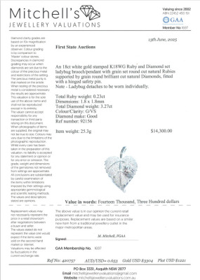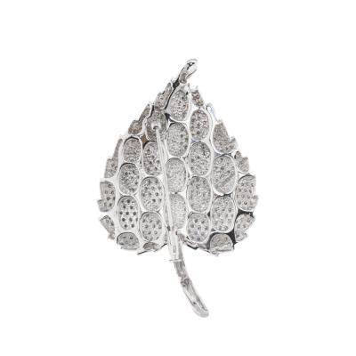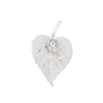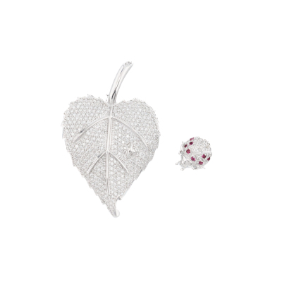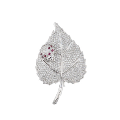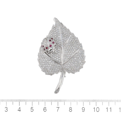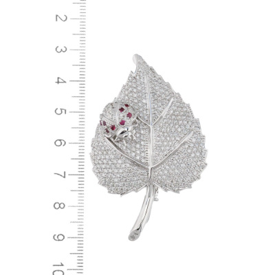 Leaf & ladybug brooch/pendant with round Natural Diamonds totalling 3.27ct (Estimated grading: G VS) and round Natural Rubies totalling 0.23ct. 18ct white gold. Leaf Size: 6cm x 3.8cm. Ladybug size: 1.4cm x 1.1cm. Weight: 25.3g. Note - Ladybug detaches to be worn individually. With Valuation Certificate #420757. (pre-owned)