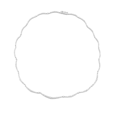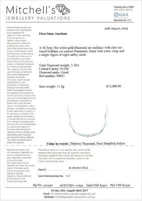 Diamond necklace with slightly graduated round Natural Diamonds totalling 3.30ct (Estimated grading: H-I SI). 18ct white gold. Length: 43.5cm. Weight: 11.5g. With Valuation Certificate #421342.