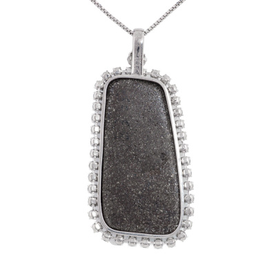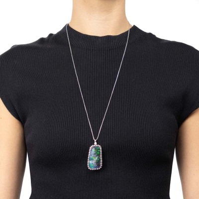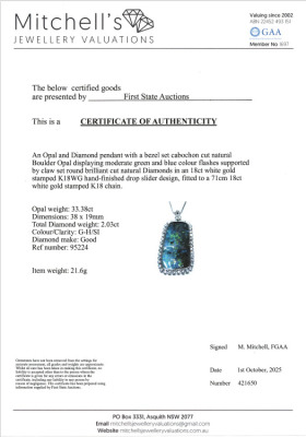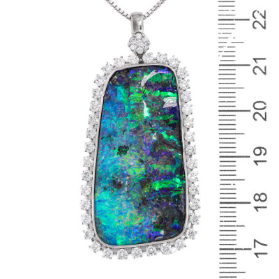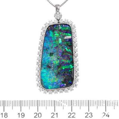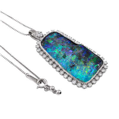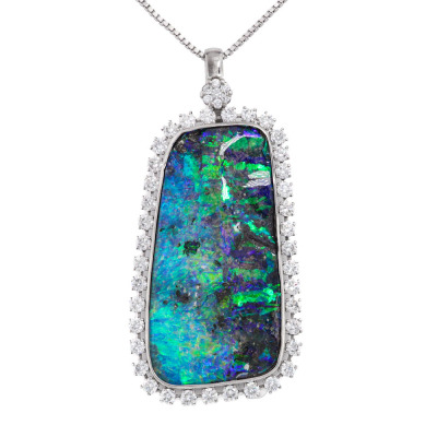 Opal and Diamond pendant with centre freeform solid Natural Boulder Opal of 33.38ct and round Natural Diamonds totalling 2.03ct (Estimated grading: G-H SI). 18ct white gold with 71cm 18ct white gold adjustable chain. Weight: 21.6g. With Certificate #421650. (Pre-owned)